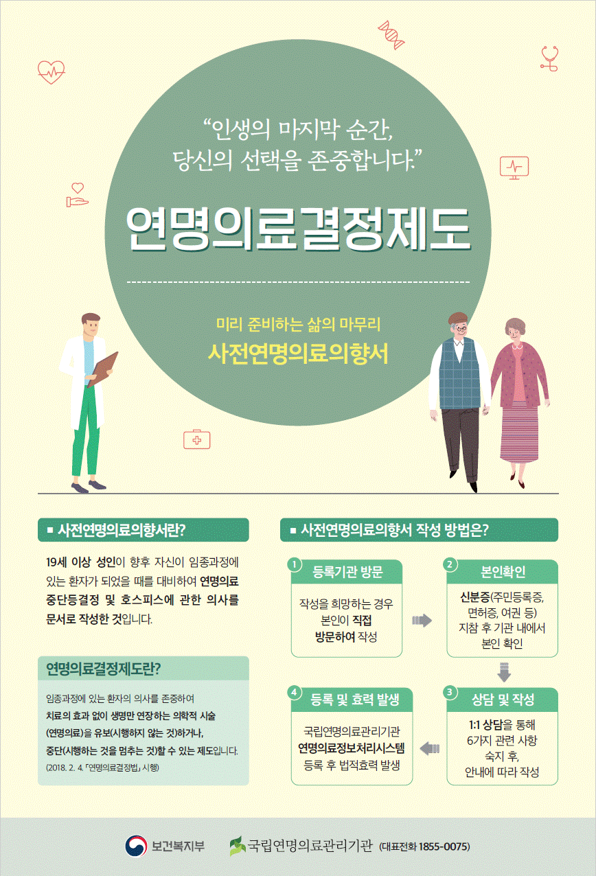 우리 기관에서는 어르신들의 생애말기 자기선택권을 존중하기 위해 "연명의료결정제도"에 대해 안내드립니다. 기타세부 사항등은 첨부자료 또는 국립연명의료관리 기관을 참고해보시기 바랍니다. ![]() |